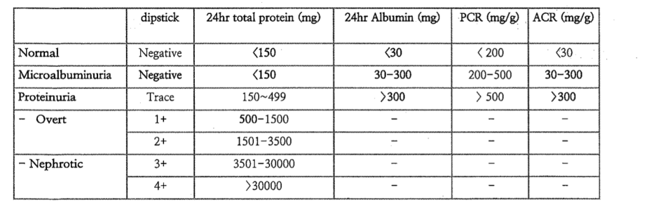 ( *정량검사 : 24시간 소변검사 혹은 아침 소변의 알부민/크레아틴 비율)