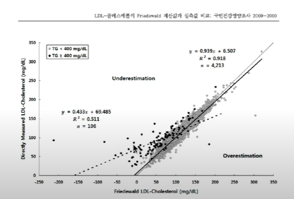 중성지방이 오를 수록 LDL 실측과 계산법이 맞지 않아진다.