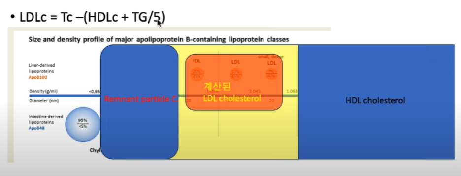 계산된 LDL은 전체 콜레스테롤에서 HDL을 빼고 중성지방의 1/5을 뺀 것이다 (IDL이 소량 포함된 것)