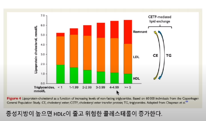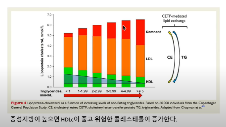 왜? HDL 콜레스테롤을 VLDL이 가져가기 때문이다.