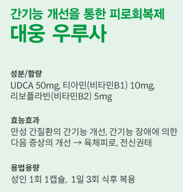 UDCA로 간기능 회복을 도와주고 비타민 복합제가 피로 회복에 도움을 줍니다.