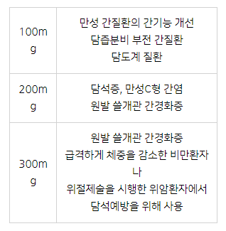 우루사 용량과 그에 따른 처방 용도는 아래와 같습니다.