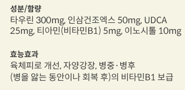 UDCA 25mg ( 대웅 우루사의 절반), 그 외 타우린, 이노시톨, 비타민D1 같은 보조성분, 하루 2회
